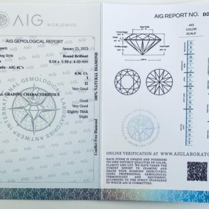 | COUPE ET FORME | Brillant rond, Coupe : Excellente, Dimensions : 6,04 x 5,99 x 4,00 mm |